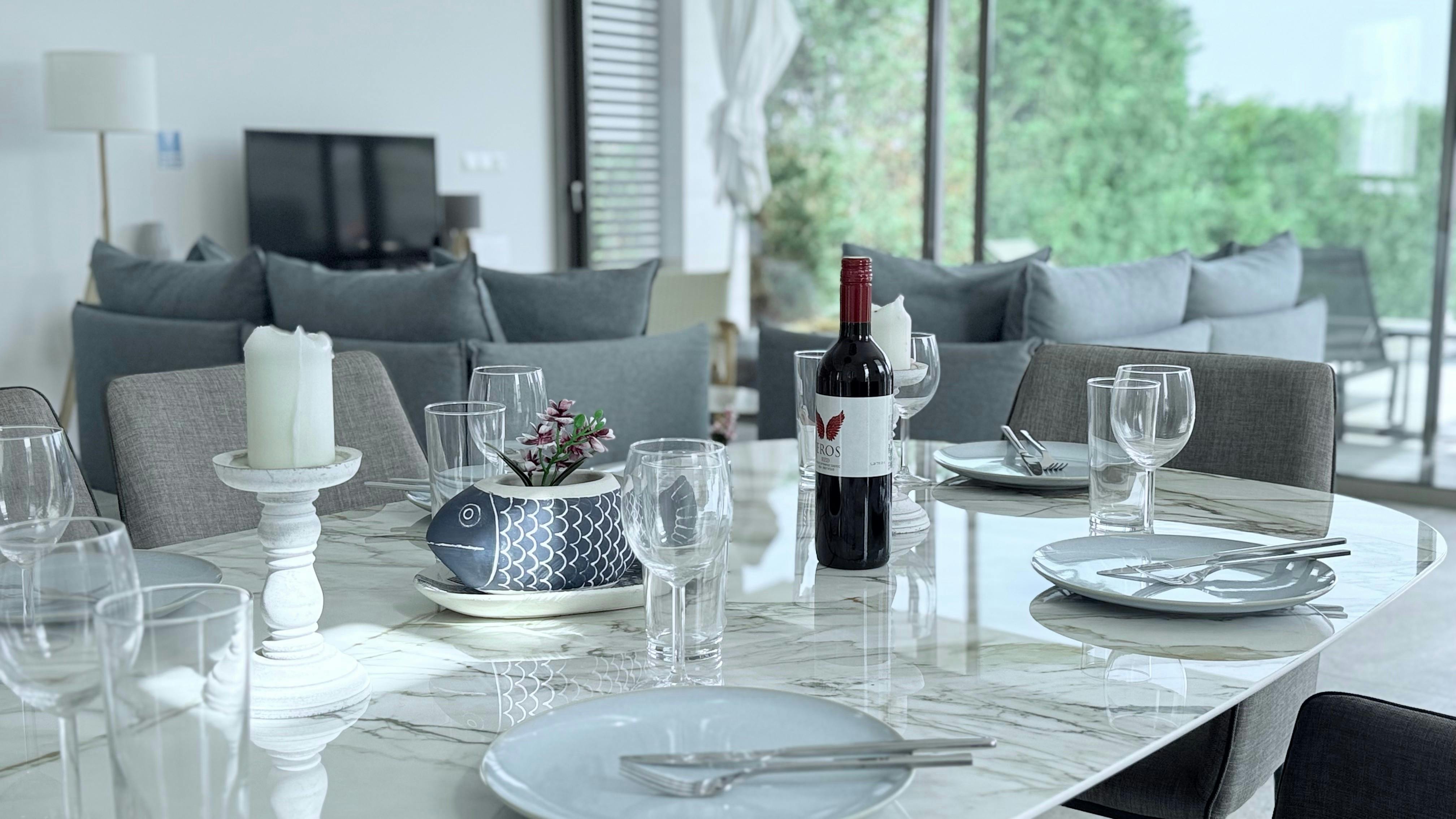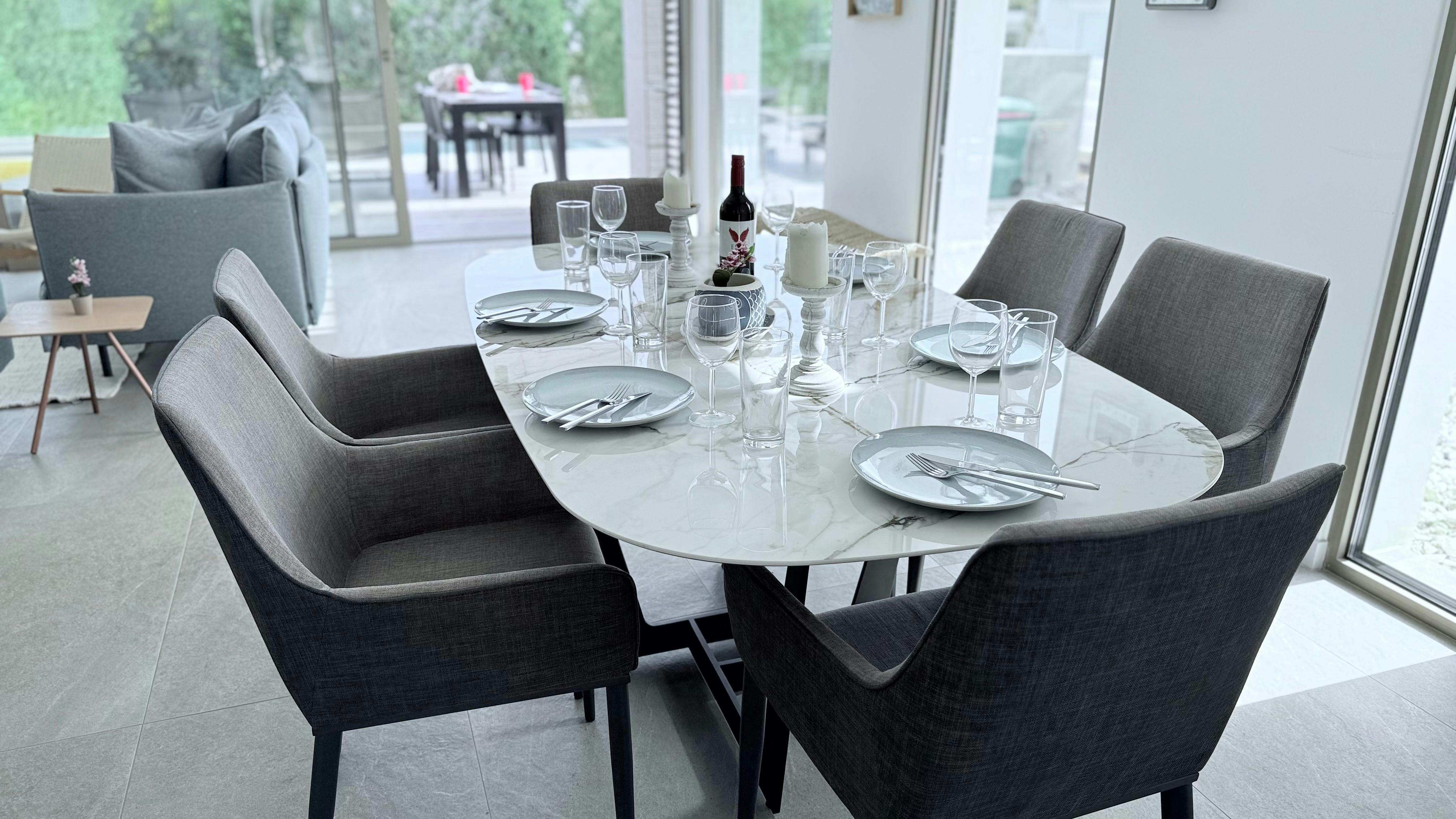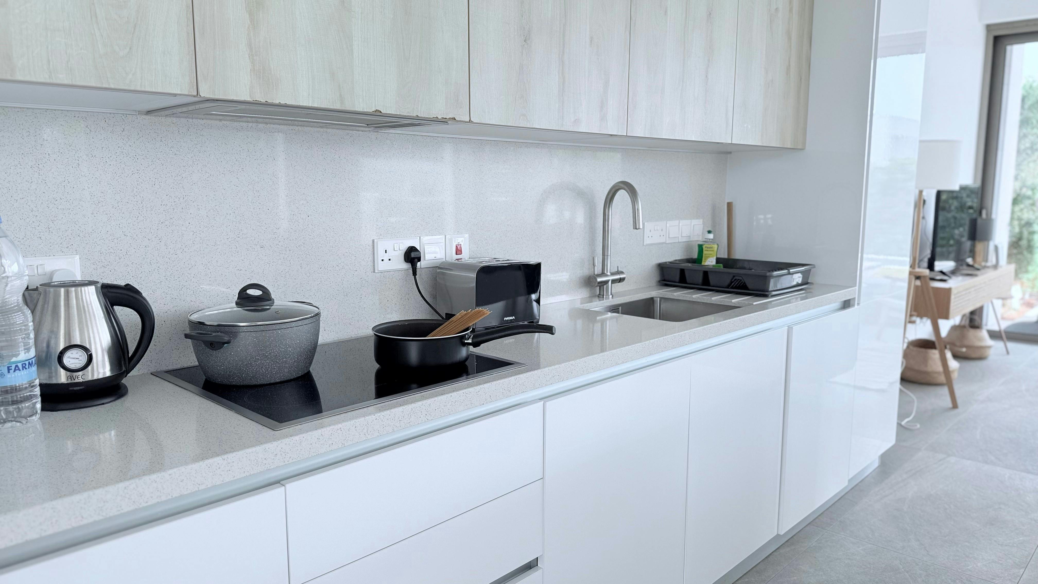 The living area is designed for both comfort and convenience, with a large corner sofa perfect for lounging while watching your favorite shows on the widescreen TV. Complimentary Wi-Fi ensures you stay connected, and the patio doors open directly to your private pool, making it easy to enjoy the beautiful Cyprus weather indoors and out. A guest WC on the ground floor adds an extra layer of convenience for your guests.